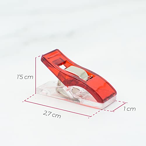 Contenuto della confezione: 50 clip in plastica e acciaio inossidabile di vari colori (blu, rosa, viola, arancione, verde, rosso). Dimensioni delle clip 2,7 x 1 x 1,5 cm, linee di demarcazione da 5 mm, 7 mm e 10 mm per misurare la distanza tra la clip e il bordo del tessuto. Apertura della clip fino a 1 cm.