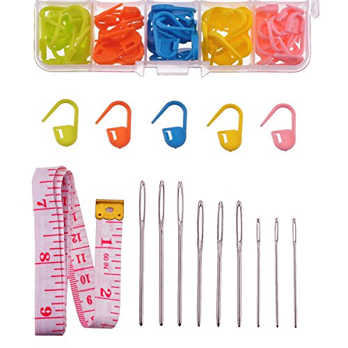 Set da cucito: la confezione include 9 aghi smussati argentati con cruna grande, 60 anelli marca punti, 1 metro da sarto in tessuto e una scatola di plastica trasparente.
