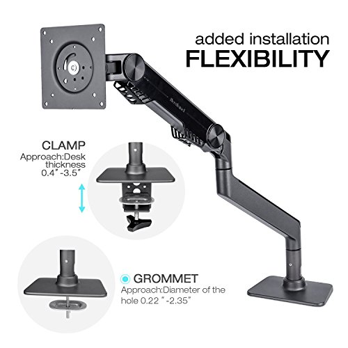 This Monitor arm mounts easily to the desk via either a desk clamp or bolt through desk mount / grommet