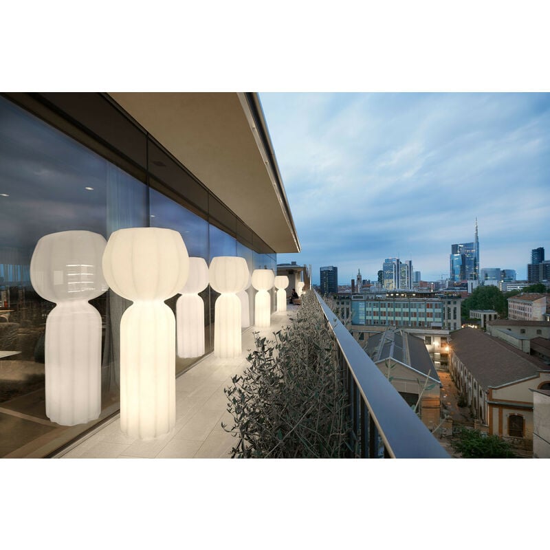 Lampada da terra in polietilene, modello Cucun. Imponente ma con stile, mordida nelle forme che richiamano il design degli anni '60 reinterpretate per colpire l'osservatore. Cucun щ la lampada da terra frutto della mente creativa della designer Lorenza Bozzoli. Il materiale con la quale щ prodotta, il polietilene, viene unito alla fibra di vetro┬а per creare ammalianti effetti luminosi. Con la sua presenza di carattere ed eleganza, Cucun щ perfetta per arredare con stile qualsiasi tipo di ambiente indoor e outdoor . Per una casa con un design moderno, per un hotel con una hall che vuole stupire, per uno spazio contract all'avanguardia o per un giardino che vuole diventare incantato...Cucun sarра la scelta perfetta in ogni caso, grazie alle due opzioni di luce: Led luce calda 3000k Led luce fredda 4000k Le sue dimensioni sono: ╪ 77 h 190 cm In caso di utilizzo esterno щ consigliato l'abbinamento con la base anti-ribaltamento o con la base fissaggio terra. Contattare il servizio