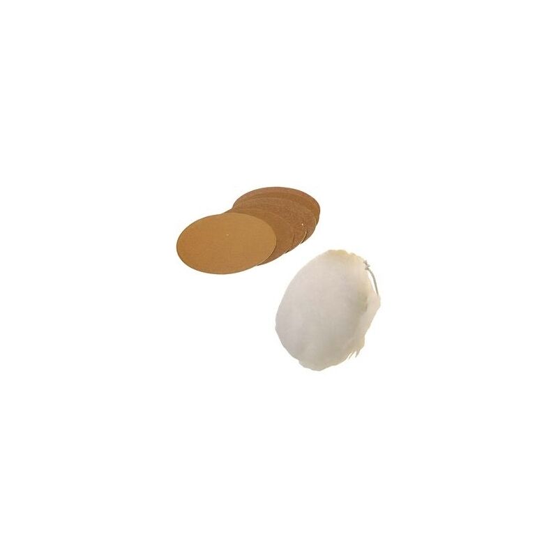 Set composto da una cuffia in lana di agnello per lucidare e 15 dischetti abrasivi in velcro per platorelli da 115 mm con foro centrale.
