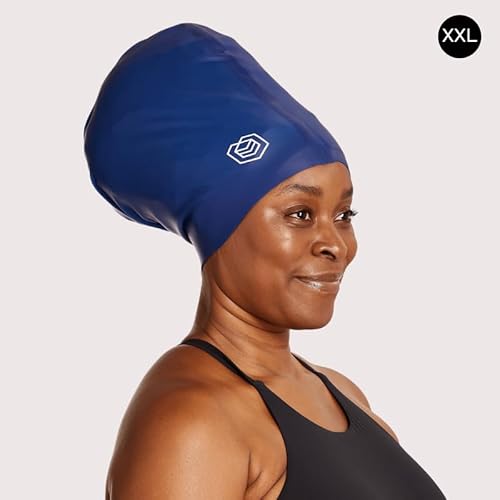 Dimensioni? La nostra cuffia da nuoto extra large è ideale per chi ha i capelli lunghi intorno e oltre la vita. Questo include: dreadlock, trame, extension per capelli, trecce, riccioli e afros. Breve volume? Non preoccupatevi, la cuffia da nuoto cadrà piatta contro la parte posteriore della testa.