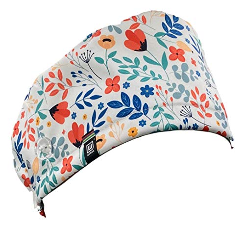 Cuffia sanitaria per sala operatoria, per uomo e donna, per infermieri, dentisti, medici, pediatri, per capelli lunghi, con bottoni e fascia per sudore frontale (fiore), multicolore, Taglia unica
