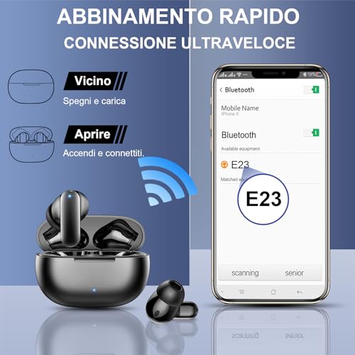 Cuffie Coinvolgenti e Accoppiamento Automatico: Cuffie Wireless E23 utilizzano una bobina dinamica in grafene da 13 mm e una tecnologia di codifica audio per fornire un'esperienza di ascolto completamente coinvolgente. Dopo aver effettuato la connessione per la prima volta, apri semplicemente la scatola di ricarica e le cuffiette bluetooth si collegheranno al tuo dispositivo, consentendoti di sperimentare velocità di connessione più elevate e una qualità del suono più chiara.
