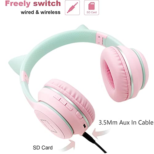 Cuffie Bluetooth cartone animato,con orecchie da gatto con luce a LED,slot per schede SD,radio FM,jack audio da 3,5 mm,cuffie sovraurali pieghevoli,senza fili e cablate,per bambini,bambine e adulti