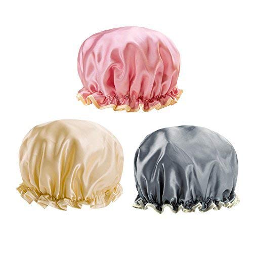 Materiali per esposizione adatti: 3 x cuffia per la doccia rispettivamente in rosa, oro e grigio, buona scelta per la doccia, la cucina, i trattamenti per la maschera per capelli e la SPA, proteggere bene i capelli e i capelli non si bagneranno mai, possono anche essere applicati per legare i capelli quando trucco, pulizia viso, ecc