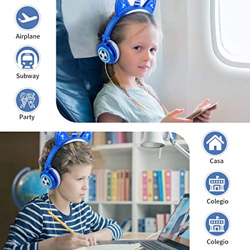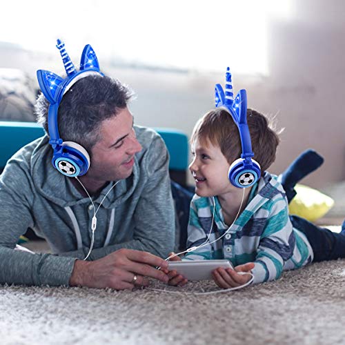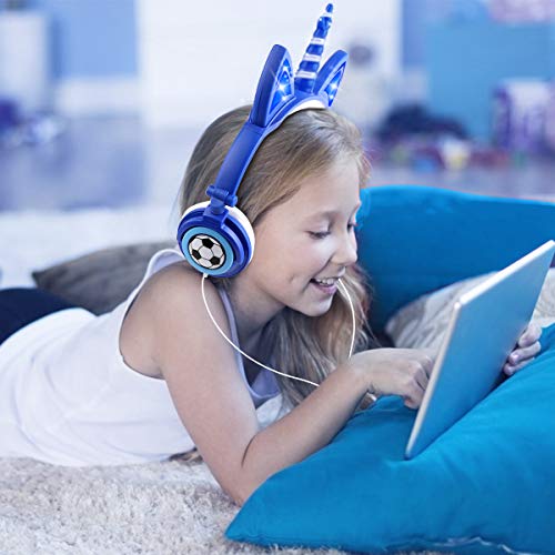 Cuffie Unicorno per Ragazzi, cuffia unicorno microfono, Sunvito cuffie gatto orecchie led, Cuffie per Bambini Unicorno con filo, 85dB Volume, Pieghevoli (Blu)