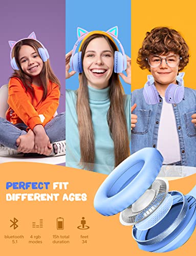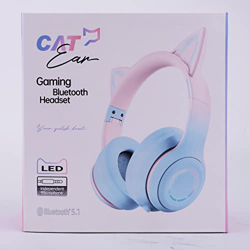 JYPS Cuffie wireless per bambini, con illuminazione a LED, per orecchie di gatto, per bambini, Bluetooth, cuffie regolabili con microfono, per adolescenti, adulti, donne, tablet blu rosa