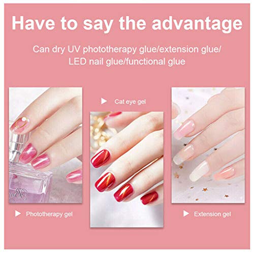 Questa lampada per unghie a LED UV è adottata con la tecnologia professionale avanzata a doppia sorgente luminosa, fa funzionare con tutto lo smalto per gel UV e lo smalto per gel LED, ad es. gel UV per unghie, gel per unghie, gel per unghie, gel per smalto, colla per gemme, gel per unghie a LED. Ci vogliono ca. 10s per asciugare la colla UV per unghie.
