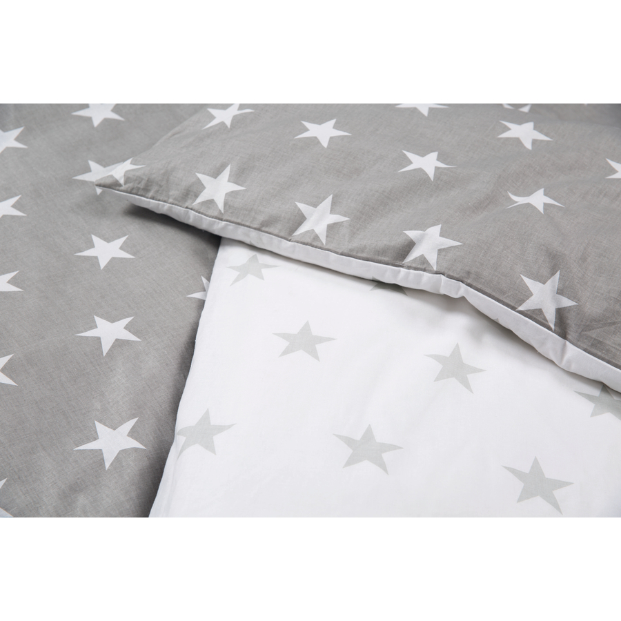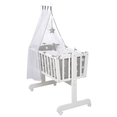 Con i set completi di roba, i piccoli possono essere cullati meravigliosamente per addormentarsi. La culla e la morbida biancheria rendono il sonno particolarmente confortevole. Se il movimento dovesse diventare eccessivo, le culle roba possono essere bloccate in modo rapido e semplice con un pulsante. Dettagli del prodotto: Culla: Colore: bianco Materiale superficie di sdraio: MDF Materiale telaio/barre: legno compensato laccato Dimensioni superficie di sdraio: Larghezza x Lunghezza 40 x 90 cm Dimensioni: Ampiezza x Lunghezza x Altezza 54 x 104 x 79 cm Misure con baldacchino: Ampiezza x Lunghezza x Altezza 53 x 93,5 x 150 cm Funzione dondolo con pulsante di blocco Capacità di carico: fino a 15 kg Con rotelle bloccabili Materasso: Dimensioni: larghezza x lunghezza 40 x 90 cm Materiale rivestimento: 100% cotone Materiale nucleo: pile di poliestere Set biancheria: Colore: grigio / bianco Design: Little Stars Dimensioni: 80 x 80 / 35 x 40 cm Materiale: 100% cotone Materiale copripiumino e federa: 100% cotone, imbottitura in pile di poliestere Materiale paracolpi: 100% cotone, imbottitura in pile di poliestere Materiale baldacchino: 100% poliestere, finiture 100% Baumwolle Incluso nella spedizione: Culla Materassino in pile Paracolpi Copripiumino e federa Asta e baldacchino Set di ruote con freni