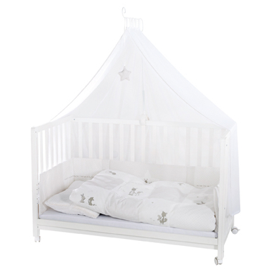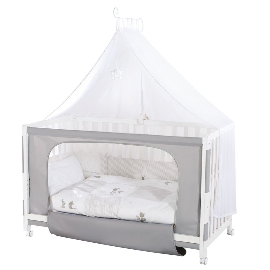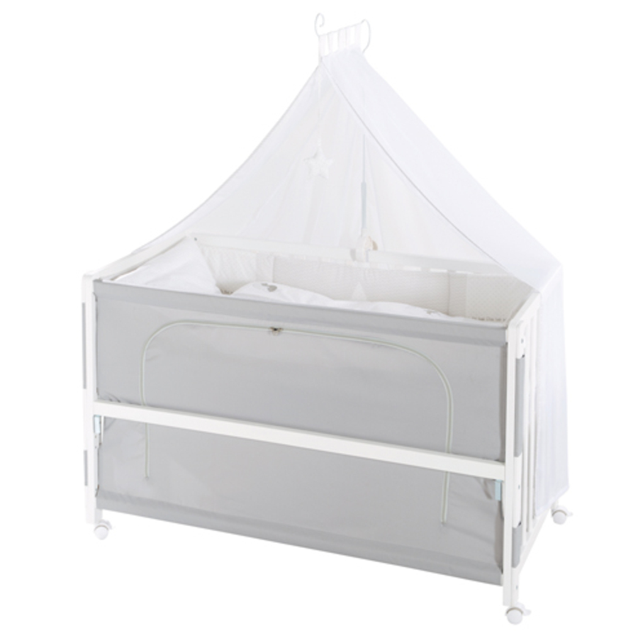 La culla Room Bed di roba permette a bambini e genitori di trascorrere tanto tempo insieme. Con un semplice gesto si adatta al letto dei genitori e diventa un lettino co-sleeping. La superficie di riposo (60x120 cm) e l'asta in metallo sono regolabili in altezza per affiancare la culla al letto dei genitori. Grazie alla pratica cerniera, la superficie laterale in Canvas si può aprire in ogni momento. Così la mamma può stare sempre vicina al suo bambino, sia di giorno che di notte. Con rotelle incluse per una maggiore mobilità. Soffice e morbido grazie al set biancheria a marchio roba incluso. Dettagli del prodotto: Lettino: Colore: bianco / grigio Materiale struttura e rete a doghe: compensato, laccato Dimensioni: larghezza x lunghezza x altezza: 66 x 126 x 157 cm Doghe regolabili in 6 altezze 1 sponda laterale in legno 1 superificie laterale apribile in tessuto Materiale tessuto: poliestere, (Canvas) Utilizzabile come lettino co-sleeping, culla o letto Con ganci in metallo per un fissaggio sicuro al letto Ruote bloccabili Portata fino a 35 kg Per lettini con una lunghezza di sdraio di 22-43 cm Materasso: Dimensioni: larghezza x lunghezza 60 x 120 cm Materiale rivestimento: 100% cotone Material nucleo: pile di poliestere Set biancheria: Colore: bianco Design: Fox & Bunny Dimensioni lenzuola: copripiumino 100 x 135 cm + federa 40 x 60 cm Materiale lenzuola: 100% cotone Paracolpi Materiale paracolpi: 100% cotone Materiale imbottitura: 100% poliestere Asta baldacchino Velo baldacchino Materiale: 100% poliestere (velo), composizione 100% cotone Incluso nella consegna: Lettino con inserto laterale in tessuto apribile Materasso Paracolpi e set biancheria Asta e velo baldacchino Ruote bloccabili Attenzione: cuscino, piumino e seconda sponda laterale in legno non sono inclusi!