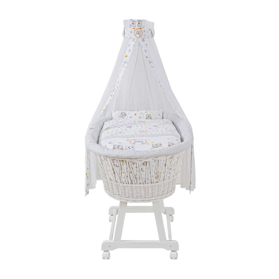 La classica culla di vimini intrecciato dà ad ogni stanza una calda atmosfera. Offre spazio extra e può essere utilizzato per molto tempo. La culla è dotata di quattro piccole ruote bloccabili che permettono di spingerla da una stanza all'altra. In questo modo puoi occuparti immediatamente dei bisogni del tuo piccolo quando è necessario. Dettagli del prodotto: Culla Colore: bianco superficie di appoggio: lunghezza x larghezza 70 x 40 cm Dimensioni: lunghezza x larghezza x altezza 94 x 77 x 60 cm Altezza culla di vimini: 31 cm Materiale sottotelaio: pino, laccato Materiale vimini: salice, laccato 4 ruote, di cui 2 bloccabili Materassino Dimensioni: larghezza x lunghezza x altezza 40 x 70 x 4 cm Materiale di copertura: 100% cotone Materiale schiuma di riempimento Il coprimaterasso è rimovibile Set culla Dimensioni della biancheria da letto: larghezza x lunghezza 35 x 40 / 80 x 80 cm Materiale del letto: 100% cotone Materiale paracolpi: 100% cotone Con guarnizione Materiale del baldacchino: Poliestere Materiale asta del baldacchino: metallo Istruzioni per la cura: La biancheria da letto e il paracolpi sono lavabili fino a 60°C, asciugatura in asciugatrice possibile. Baldacchino lavabile fino a 30°C Incluso nella consegna: Culla Asta del baldacchino Baldacchino mMterasso Set culla Attenzione: cuscino e piumino non sono inclusi.