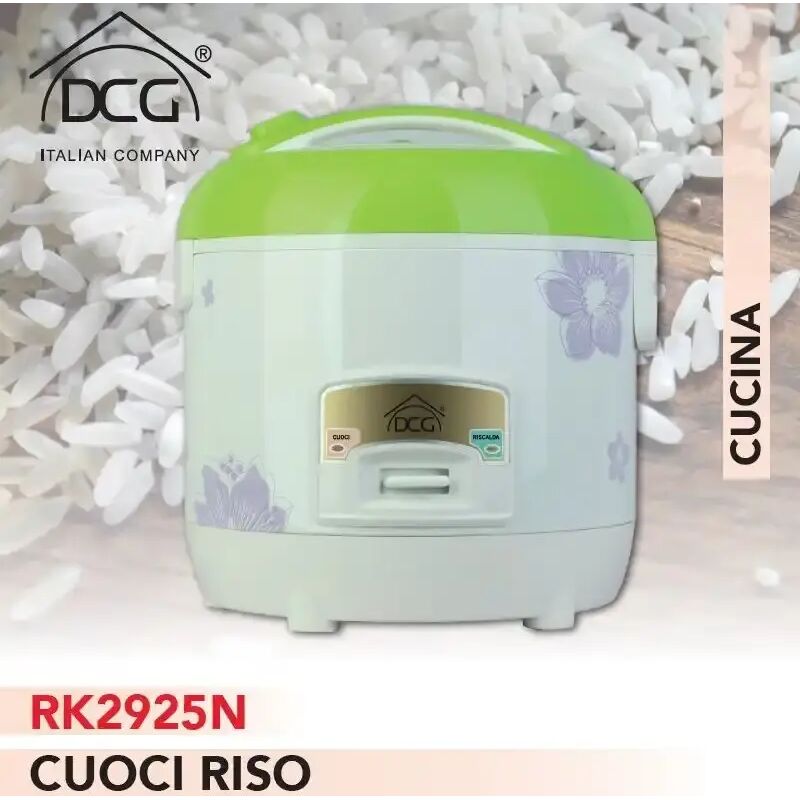 CUOCIRISO DCG MOD. RK 2925 Attenzione: la coppetta con il riso e le bacchette non sono incluse CARATTERISTICHE Semplice preparazione e mantenimento al caldo di tutte le tipologie di riso Nessun pericolo di bruciatura Struttura Cool-Touch isolata dal calore Coperchio sollevabile con maniglia Cool-Touch rientrante Recipiente per la cottura antiaderente e removibile Capacita (circa 5 l) per un max. di 1250 g di riso Sistema di mantenimento del calore una volta terminata la cottura Cestino per trattenere le vitamine durante la cottura a vapore Cavo elettrico removibile Spia luminosa per controllo stato di funzionamento Accessori: bicchiere misurino e cucchiaino da riso Potenza 700 watt Dimensioni P 28 x L 26 x H 27 cm Alimentazione 220 Volt 50 Hz EAN 8032774622098 Modello RK2925