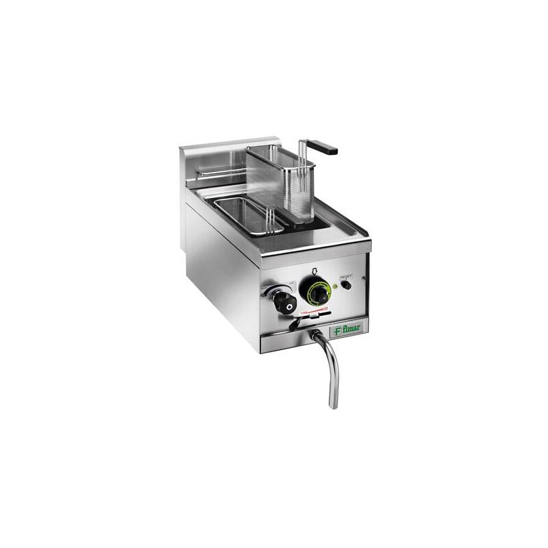 Codice RS0785 - Cuocipasta elettrico da banco modello FI-CP11N, dimensioni cm. 30x60x41 (lxpxh), 230 volt, 3.5 kw, capacità vasca 11 lt, capacità 1 kg, produzione oraria 7 kg, n.2 cestelli compresi nella fornitura. Struttura, coperchi e cestelli in acciaio inox. Vasca in acciaio inox AISI316 spessore 15/10. Manici cestelli e pomelli coperchi in materiale isolante. Resistenze corazzate in acciaio inox incoloy. Sistema di scarico a innesto frontale a baionetta. Camino rialzato con funzione paraspruzzi.