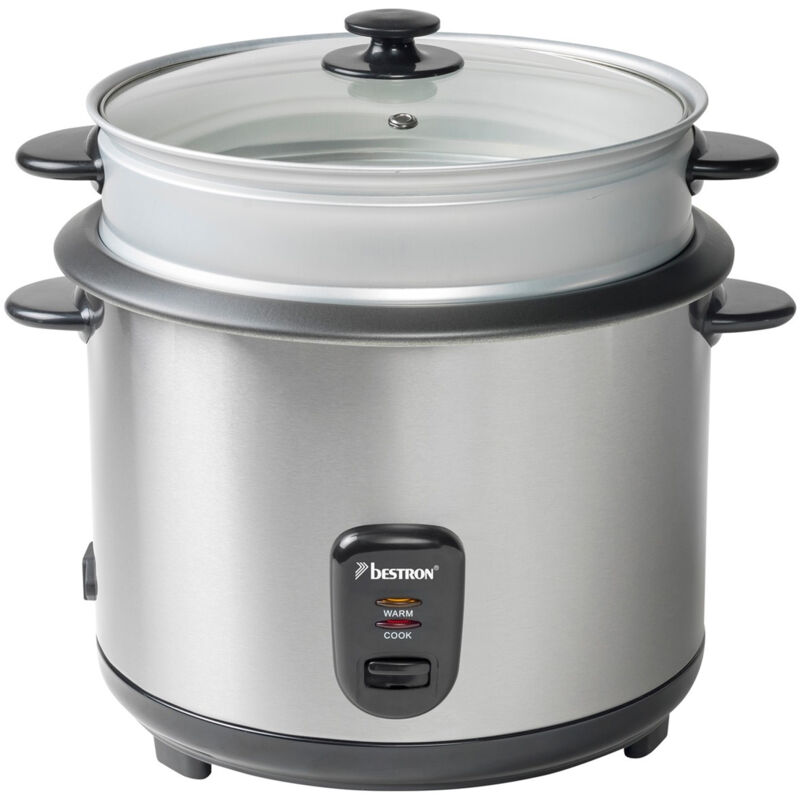 Cuociriso Bestron ARC280 Cuoce in modo rapido e completamente automatico tutti i tipi di riso, come riso bianco, riso integrale, basmati, pandan, sushi, risotto, ecc. Mantiene il riso alla giusta temperatura per diverse ore con la funzione di mantenimento in caldo Ciotola per vapore extra (Ø 26,5 cm) per una preparazione sana e contemporanea di pesce, carne, verdure, ecc... Capacità massima 2100 grammi di riso = 14 porzioni abbondanti = da 13 a 15 persone Funzionamento semplice e spegnimento automatico 2 Spie luminose per cottura e conservazione caldo Pentola interna rimovibile (2,8 litri) con rivestimento antiaderente Indicatore del livello dell'acqua Con coperchio in vetro Inclusi misurino e cucchiaio per il riso Pentola interna lavabile in lavastoviglieCon marchio di qualità certificato GS = standard di qualità e sicurezza extra elevatoPotenza: 1000 WattColore: acciaio inossidabile