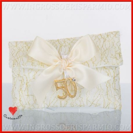 Sacchetto in tessuto bianco e oro con fiocco e ciondolo numero 50