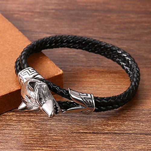 Cupimatch Uomo Braccialetto Bracciale Pelle Testa di Lupo Nero