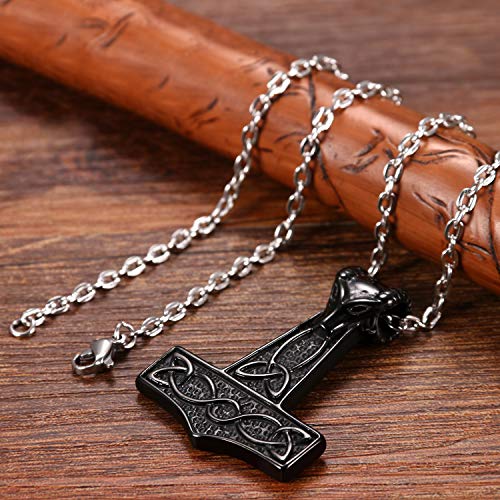 Cupimatch, collana con ciondolo a forma di martello vichingo di Thor, testa di ariete e nodi celtici, nero, in acciaio inox, catena da 55,9 cm inclusa, gioiello unisex