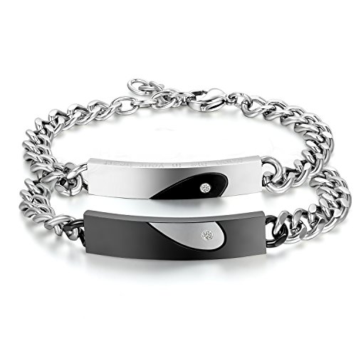 Cupimatch, set di gioielli per coppie, collane con ciondolo a puzzle in acciaio inox, bracciali dell'amicizia a maglie con zirconia, da uomo e da donna, di colore argento e nero
