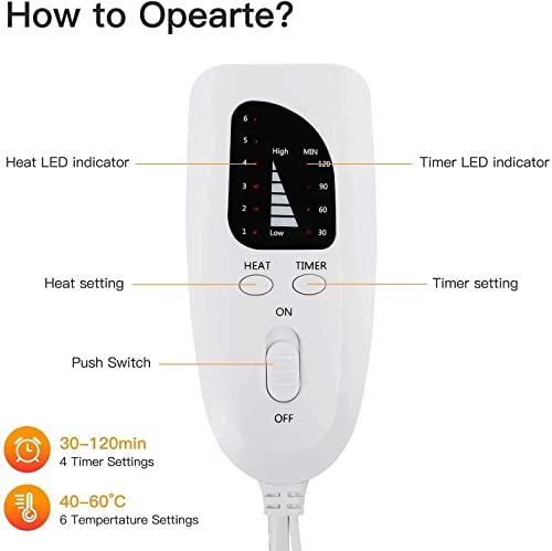 【Funzione di Spegnimento Automatico】: il termoforo elettrico ha una funzione di temporizzazione a 4 velocità. Se dimentichi di impostare il timer, si spegnerà automaticamente dopo 2 ore. Il display a LED del timer diminuisce di un livello ogni 30 minuti. Prevenire le ustioni.