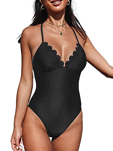 CUPSHE Costume da bagno intero per le donne costume da bagno smerlato scollo a V spaghetti croce posteriore cinghie regolabili taglio alto, nero, M