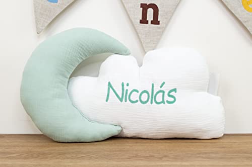 ⭐COSA INCLUDE: 1 Cuscino a forma di luna (non ricamato) fatto in tessuto de bambula mint 100% cotone biologico. 1 Cuscino a forma di nuvola ricamato con il nome del bambino e fatto in tessuto de bambula bianca 100% cotone biologico. Entrambi i cuscini sono forniti con imbottitura morbida e soffice inclusa.
