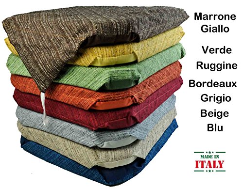 In tinta unita melangiata, cioe' abbellita da sfumature di piu' colori per ravvivare il semplice colore unito senza appesantire.Modello ALETTE, ali triangolari che fasciano la tua sedia legandosi con 4 elastici sotto la seduta in modo pratico e semplice e che permette di avere un cuscino fermo e sempre in ordine.