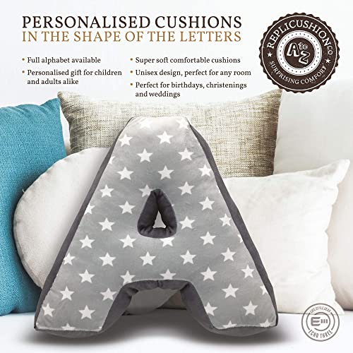 Cuscino alfabeto a forma di lettera A, decorazione per divano, camera da letto, scuola materna, iniziale personalizzata, con stelle, grigio, regalo di battesimo e nozze