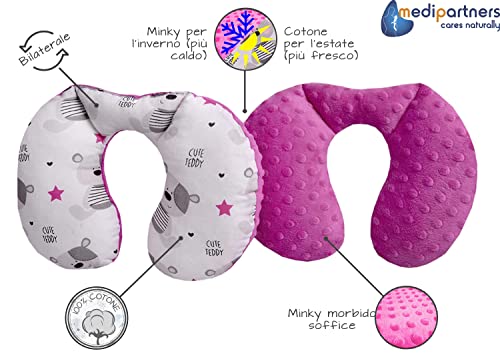 Cuscino cervicale per bambini 100% Cotone/Minky Medi Partners Cuscinetti cervicale per auto per il collo del sonno da Viaggio in Auto Passeggino (Teddy con Minky rosa scuro)
