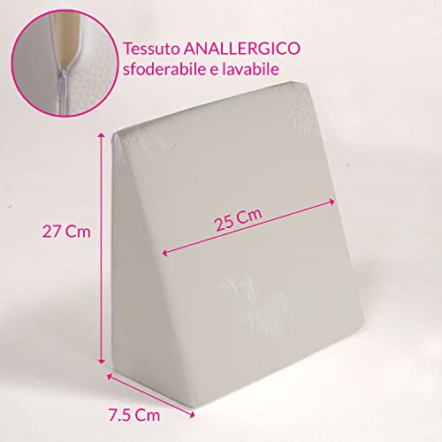 Cuscino triangolare dimensioni 27 x25 x 7,5 cm di altezza con particolare tessuto anallergico e antiacaro, liscio e morbido in fibra anallergica. Sfoderabile e lavabile a 30 gradi in lavatrice.