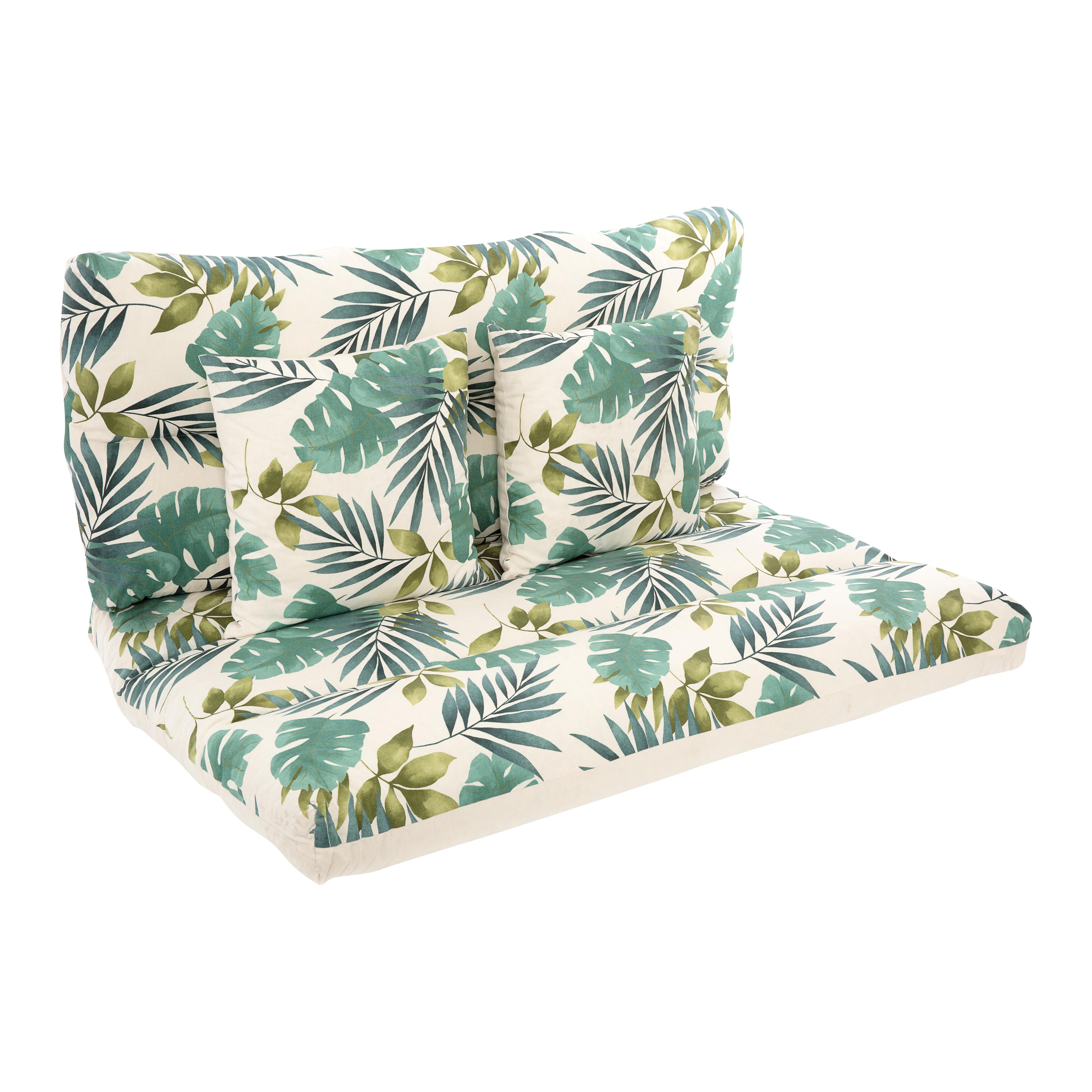 Set di 4 cuscini: seduta e schienale L 120, più 2 cuscini quadrati decorativi. Ideali per realizzare un divano 2 posti insieme ad una pila di bancali del classico formato 120 x 80 cm