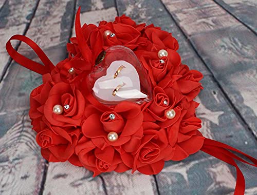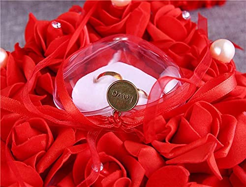 Cuscino per Fedi Nuziali Rosa Rossa Cuscino Romantico Fedi Matrimonio Include Grandi Perle, Strass Brillanti, Scatola per Anelli, 2 Anelli, 20 X 20 cm