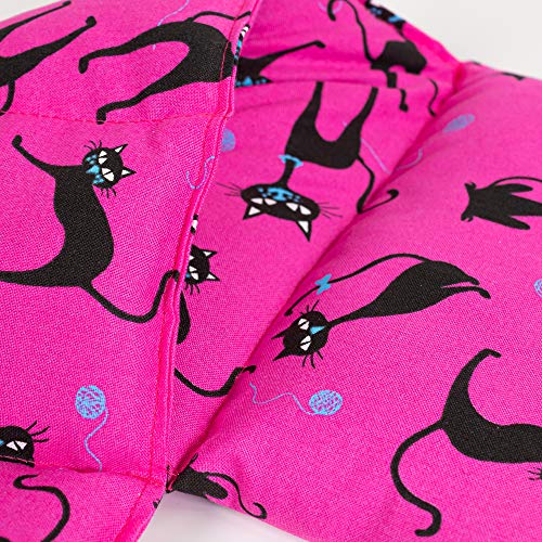 Cuscino con semi di ribes, 75x20cm. Cuscino termico con 8 compartimenti, per la schiena, il ventre e molto altro. Terapia caldo e freddo (gatto nero-sfondo fuchsia)