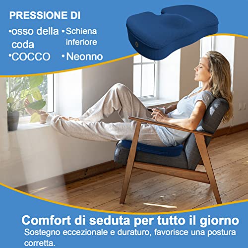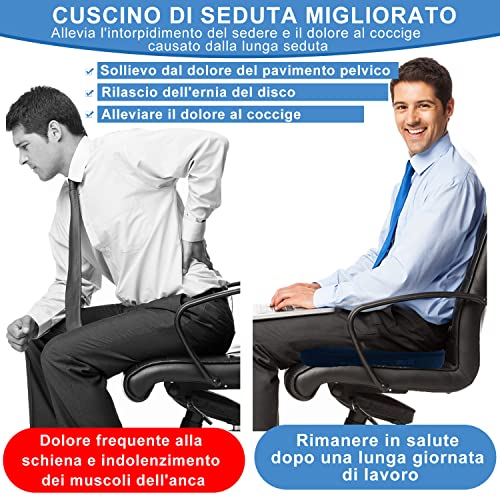 Comfort immediato per qualsiasi sedia: La schiuma di memoria ad alta densità e a rimbalzo rapido è resistente e duratura e il suo design ergonomico avvolge le cosce e i glutei per garantire la massima stabilità. È ottimo per ridurre la compressione sul coccige.