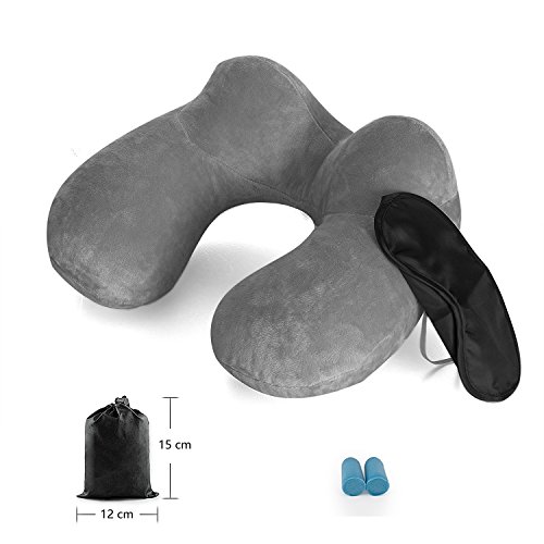 Cuscino da Viaggio Gonfiabile a 4 Supporti,LUZWAYCuscino per il Collo Ergonomico con Tappi per le Orecchie e Maschera per gli Occhi Ideale per viaggiare in aereo,auto e treno [Grigio Scuro]
