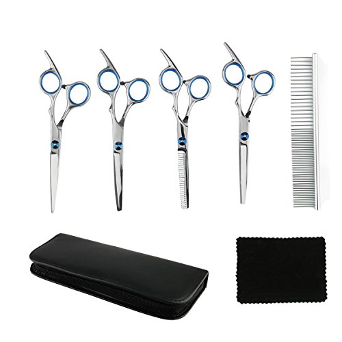 Cusfull 5 pezzi Set Forbici Gatti Cane Pet Grooming PROFESSIONALE Forbici in Acciaio Inossidabile per Tagliare e Sfoltire Cesoie Strumento per taglio di capelli Hair Styling -Custodia in soffice pelle per riporlo al sicuro e garantirne una lunga durata