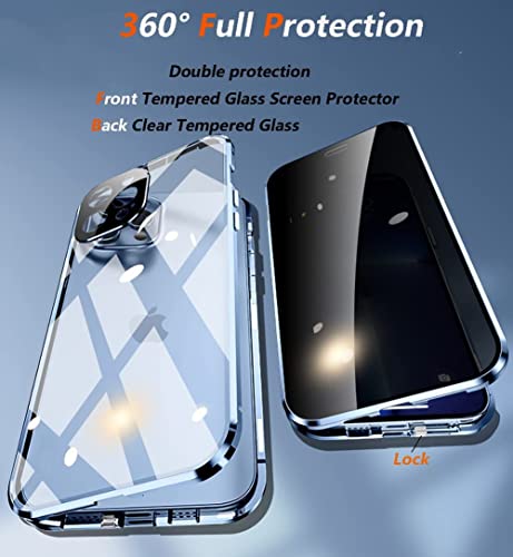 Anti Peep Custodia Compatibile con iPhone 14, Adsorbimento Magnetica Anti-Spia Cover 360 Gradi Protezione Privacy Vetro Temperato Anti-Peeping Custodia Metal Bumper Case Cover,Blu