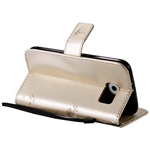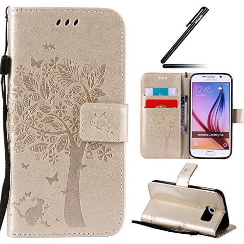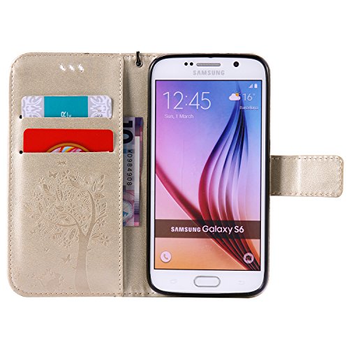 Custodia Compatibile Samsung Galaxy S6 Edge Cover KunyFond 3D Design Gatto Albero Goffratura PU Cuoio Serie Lusso Vintage Dipinto Pelle Portafoglio Flip Copertura Donna Ragazze Supporto Bumper,D'oro