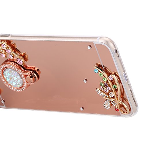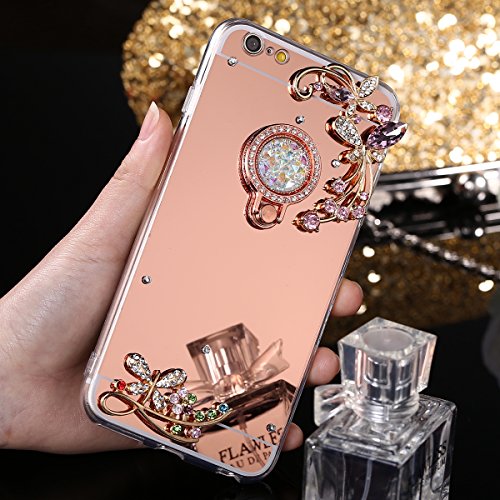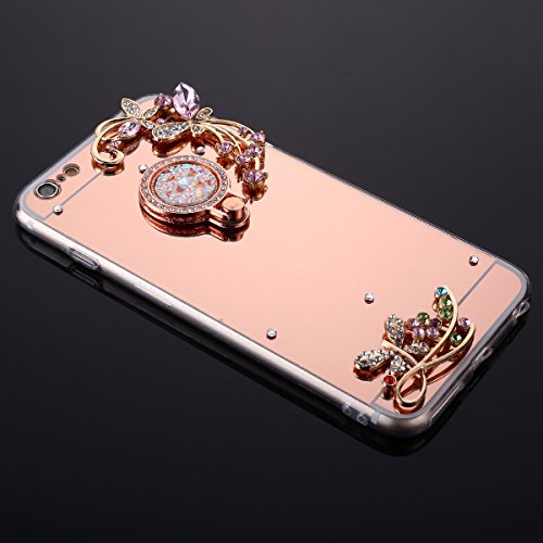 Custodia Cover Case per iphone 6/6s 4.7,TPU Case iphone 6/6s 4.7,Etsue Cristallo Crystal TPU Specchio Mirror Scintillio Diamond Strass Anello tondo diamantato Farfalla Fiore tpu Silicone Morbida Cover Reflective Backcover Mirror used Custodia Ultra Sottile TPU Morbida Silicone Antigraffio Antipolvere Protettivo Bumper Case per iphone 6/6s 4.7 +1X penna stilo blu+1X Bling Dust Plug-Oro rosa