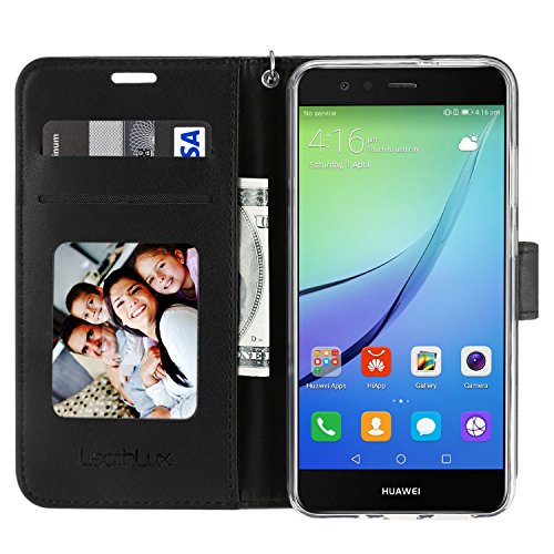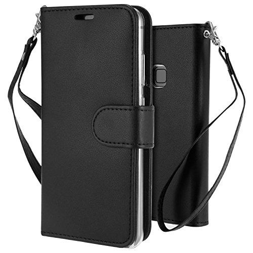 Custodia P10 Lite Cover Nero, Leathlux Puro Colore Modello Design Con Cinturino da Polso Magnetico Snap-on Book style Internamente Silicone TPU Custodie Case in pelle Protettiva Flip Case Cover per Huawei P10 Lite 5.2"