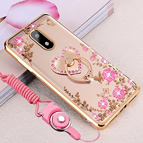 Custodia Cover Nokia 6 Silicone Morbido, Ukayfe Ultra Slim Case Caso Resistenti per Nokia 6, Confine di Placcatura Disegni Bella Vintage Elegante Trasparente Casa Coperture Sottile Soft TPU Gomma Gel [Intarsiato Glitter Brillantini Bling Diamante Amare Porta Anello], Particolari Fantasia Lusso Antiurto Protettiva Anti-scratch Skin Cover Bumper per Nokia 6,Cordoncino+Rosa:fiore rosa