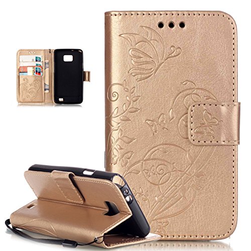 Custodia Galaxy S2 Cover,Cover Galaxy S2 Plus,ikasus Goffratura Vines Fiore Farfalle Modello Flip Cover Portafoglio PU Pelle Protective Wallet Stand Custodia Cover per Galaxy S2/S2 PLUS,D'oro