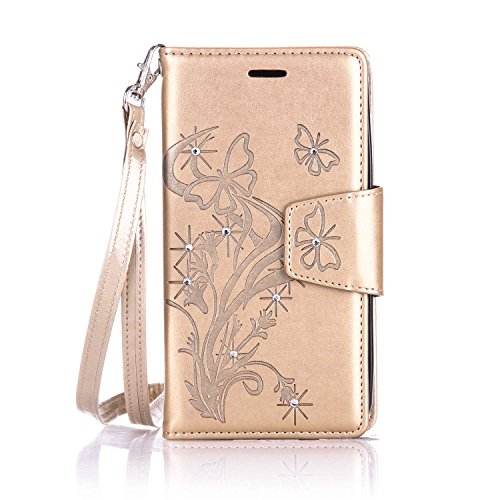 Custodia Galaxy J3 ISAKEN Cover Samsung Galaxy J3 con Strap, Elegante borsa Farfalla Design in Pelle Sintetica Ecopelle PU Case Cover Protettiva Flip Portafoglio Case Cover Protezione Caso con Supporto di Stand / Carte Slot / Chiusura - Diamnate farfalle: gold