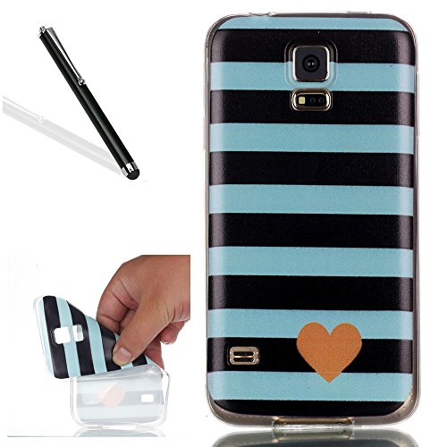 Custodia Galaxy S5/S5 Neo,Galaxy S5/S5 Neo Silicone Case,Leeook Creativa Blu Nero Striscia Cuore Design Ultra Slim Sottile Morbida TPU Gel Cover Case Shock-Absorption Anti Scivolo Custodia Protettiva Gomma Case Caso Anti-scratch Skin Shell Case Coperture Bumper Cover per Samsung Galaxy S5/S5 Neo + 1 x Nero Stilo-Blue Black Strip Heart