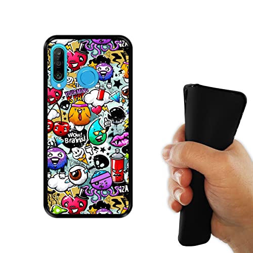 Custodia per [ Huawei P30 Lite ] Disegni [ Astratto, Texture di Graffiti con Personaggi Animati 2 ] Cover Guscio in Silicone Flessibile Nero TPU
