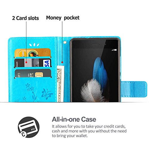 Custodia Huawei P8 Lite, iDoer Retro Farfalla Fiore Modello Stampata Design Con Cinturino da Polso Custodia in pelle Protettiva Cuoio Portafoglio Flip Cover per Huawei P8 Lite Blu