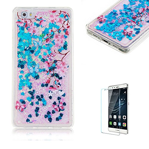 Custodia Per Huawei P8 Lite 2016 Modello 5.0" Cover in Silicone Morbida,Funyye Brillantini Muovono Liquida Sequin Cuori Blu Glitter Flowing Quicksand 3D Creative Disegno Copertura +[Pellicola Protettiva] Sottile Gomma Gel TPU Protettivo Caso Huawei P8 Lite 2016 Modello 5.0" Soft Shine Bling Liquid Case Shell Bumper - Farfalla Blu e Fiori Rosa