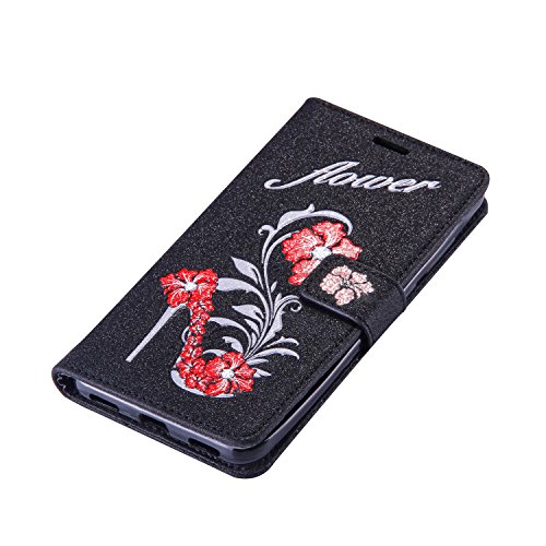 Custodia per Huawei Y6 II, Huawei Y6 II Custodia Pelle, Cover Huawei Y6 II, Ekakashop Lusso Moda Glitter Sparkle Fiore e Tacchi alti Modello Disegno Design Portafoglio Bookstyle Folding Flip Cover in PU pelle Borsa Con Cordicella Portatile Antiurto Shock-Absorption Shell Ultra Slim 3D Gel Silicone Protittiva Cover Case Custodia per Huawei Y6 II Con 1x Ekakashop Kickstand (Colore casuale), Nero