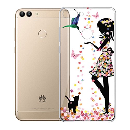 Custodia per Huawei P Smart / Enjoy 7S, IJIA Trasparente Uccello Gatto Gonna Floreale Ragazza TPU Silicone Morbido Protettivo Coperchio Protettiva Case Cover per Huawei P Smart / Enjoy 7S (5.65")