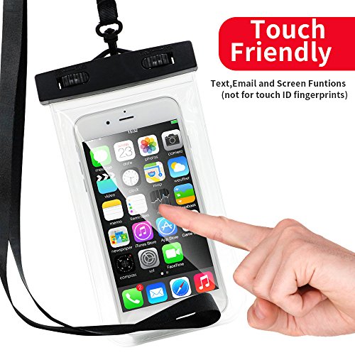 Questa custodia impermeabile è realizzata in resistente materiale del PC e che sigilla il sacchetto in modo sicuro.Si prega di inserire il vostro telefono upside down in esso. Il lato anteriore e la parte inferiore del lato posteriore sono chiaro trasparente, che è perfetto per scattare foto sott' acqua. Trasparente e sottile design non compromettere la sensibilità touch del telefono, quando lo si utilizza in acqua proprio come si tocca il vero vetro.